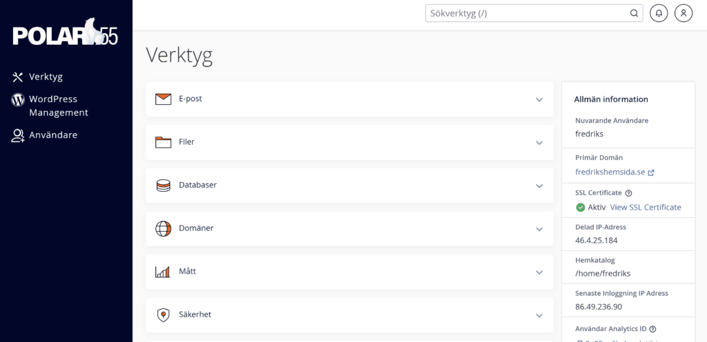 Hos Polar55 är det enkelt att administrera och underhålla dina WordPress-sajter på ett och samma ställe – webbhotellet erbjuder nämligen en central kontrollpanel, i form av cPanel. Det spelar ingen roll om du har en eller tjugotals webbsajter, du kan administrera dem härifrån.