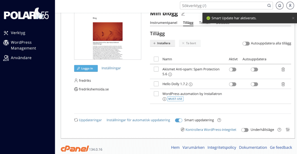 Vill du ha mer kontroll över uppdateringarna? Då kan du till exempel välja Smart uppdatering som låter dig se hur uppdateringarna påverkar din sajt, genom att testa dem på en klon först.